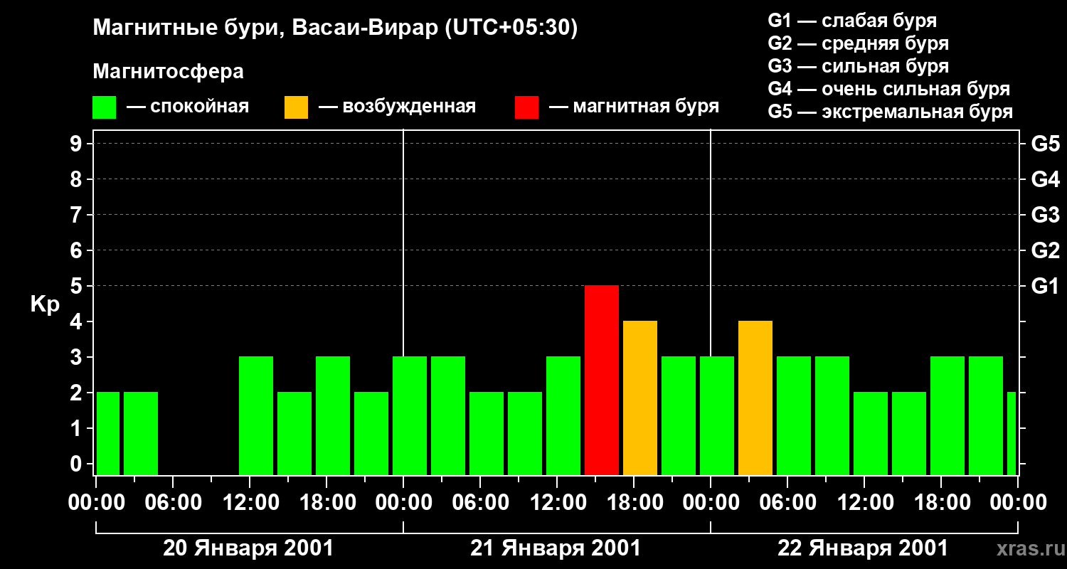 Изменения геомагнитного индекса Kp с 20 по 22 января 2001 года для средних широт