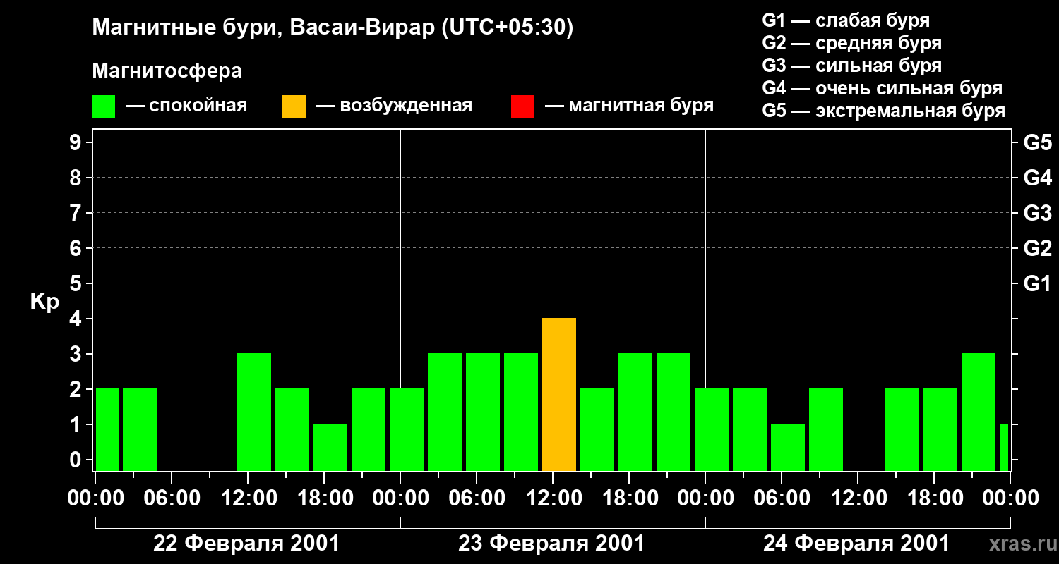 Изменения геомагнитного индекса Kp с 22 по 24 февраля 2001 года для средних широт