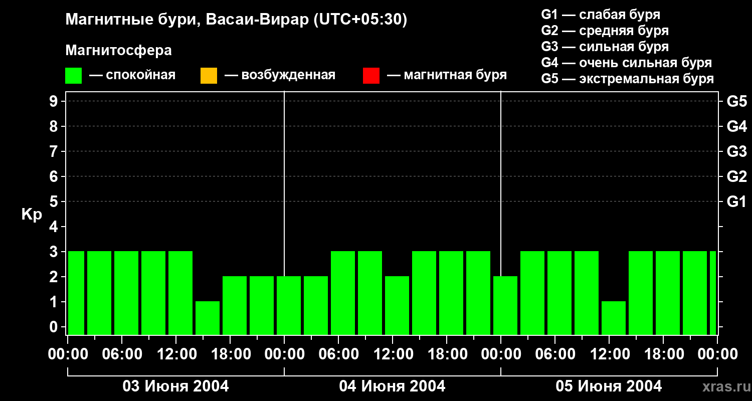 Изменения геомагнитного индекса Kp с 3 по 5 июня 2004 года для средних широт