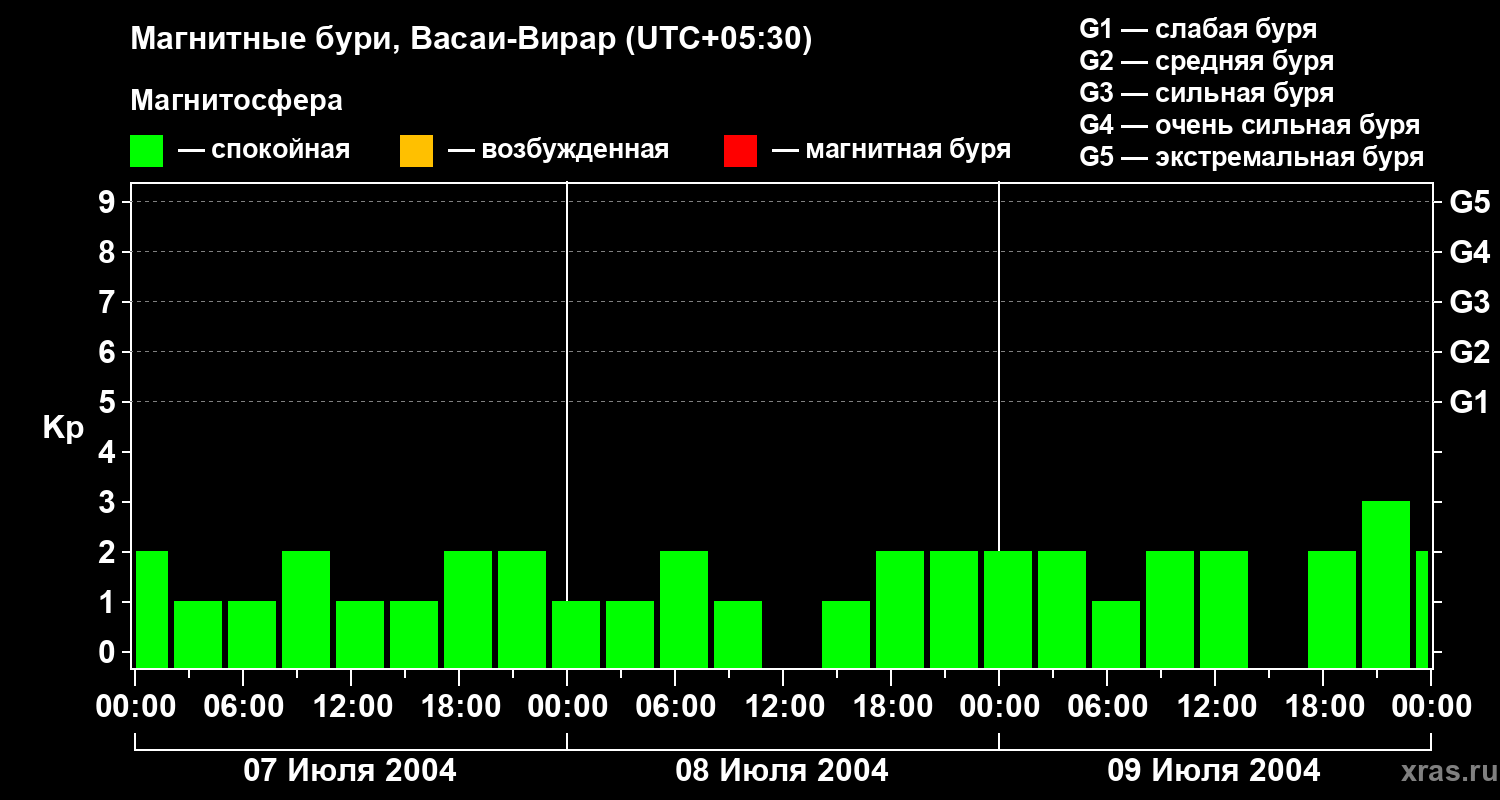 Изменения геомагнитного индекса Kp с 7 по 9 июля 2004 года для средних широт