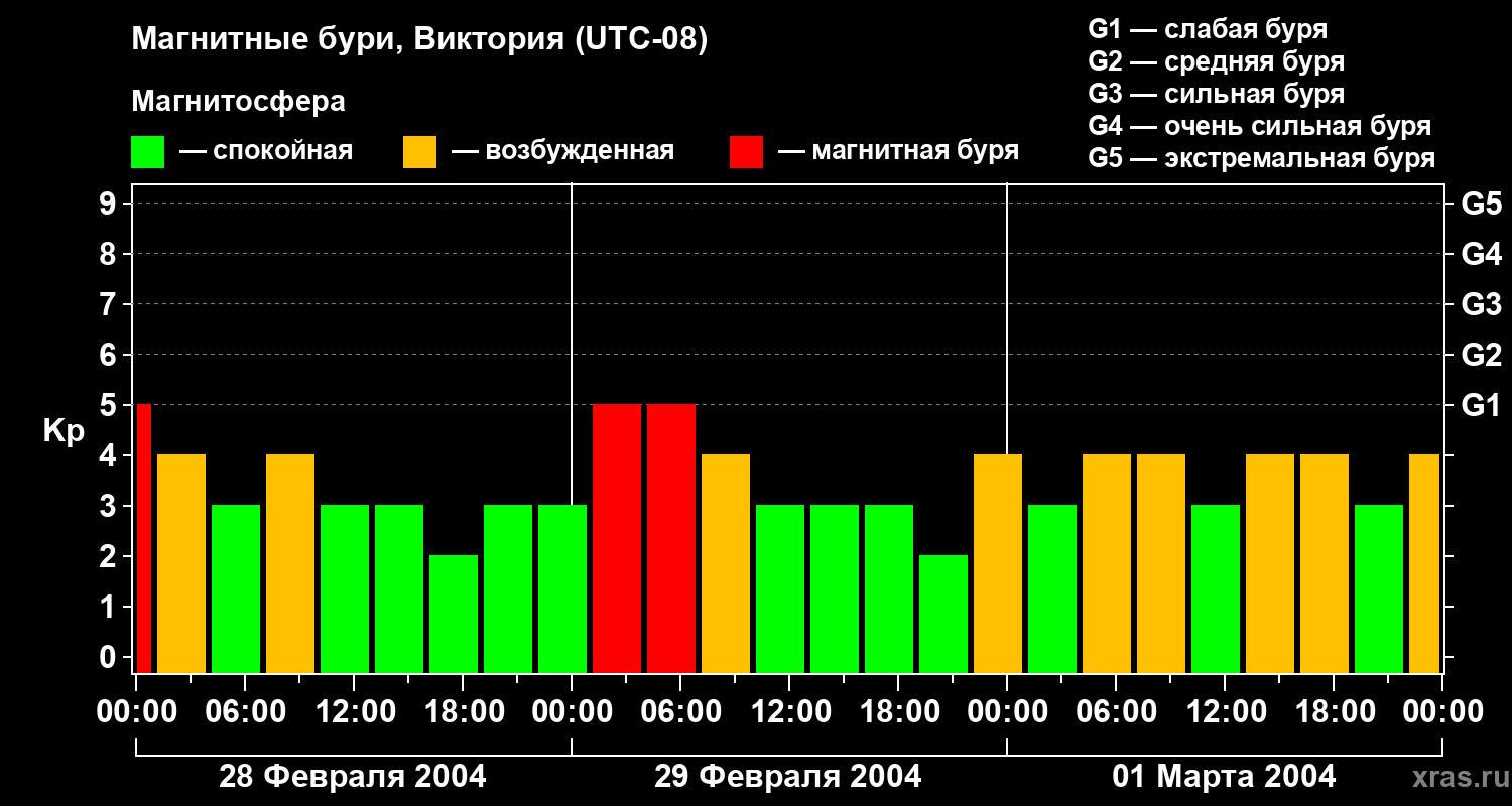 Изменения геомагнитного индекса Kp с 28 февраля по 1 марта 2004 года для средних широт