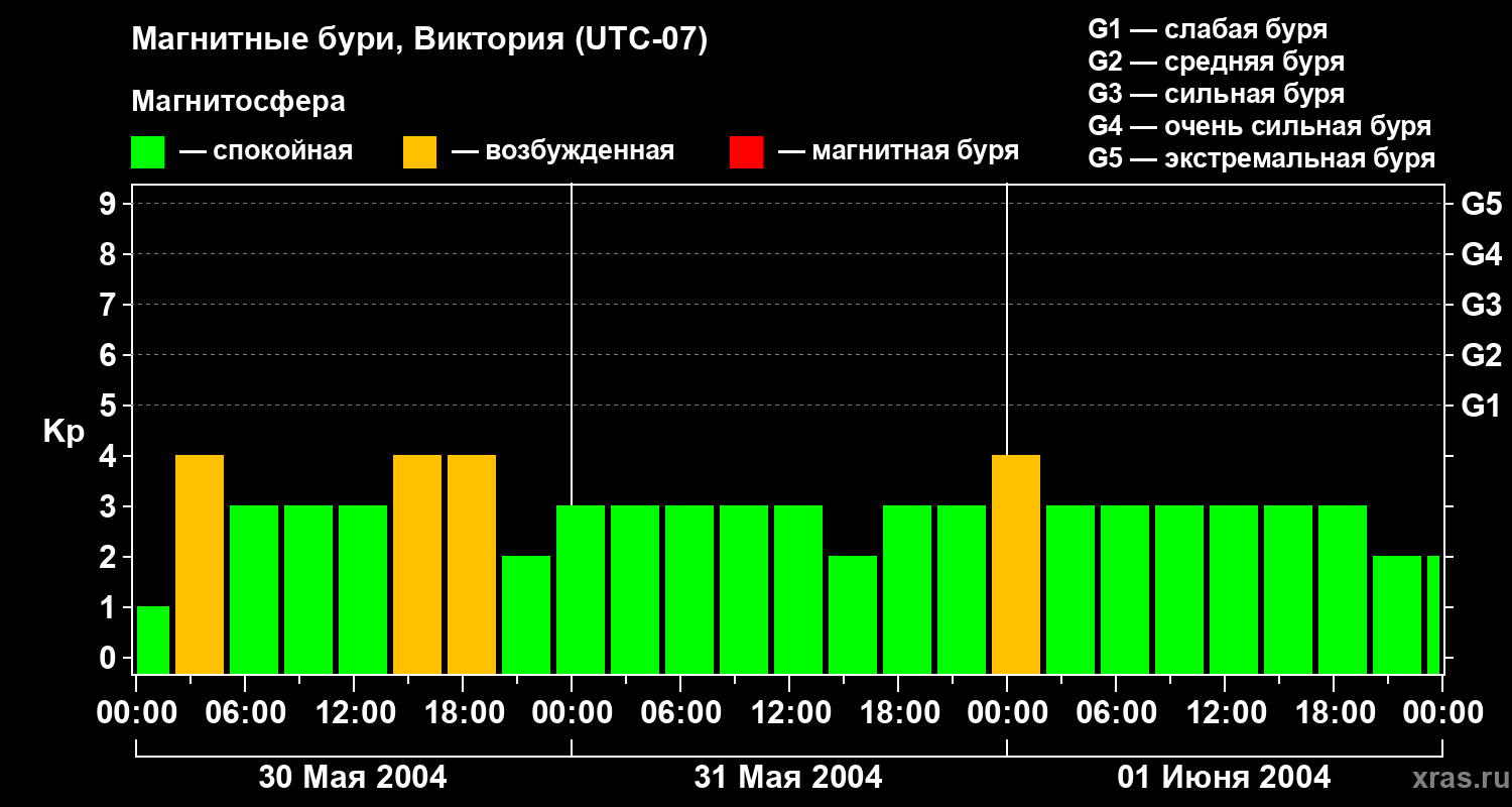 Изменения геомагнитного индекса Kp с 30 мая по 1 июня 2004 года для средних широт