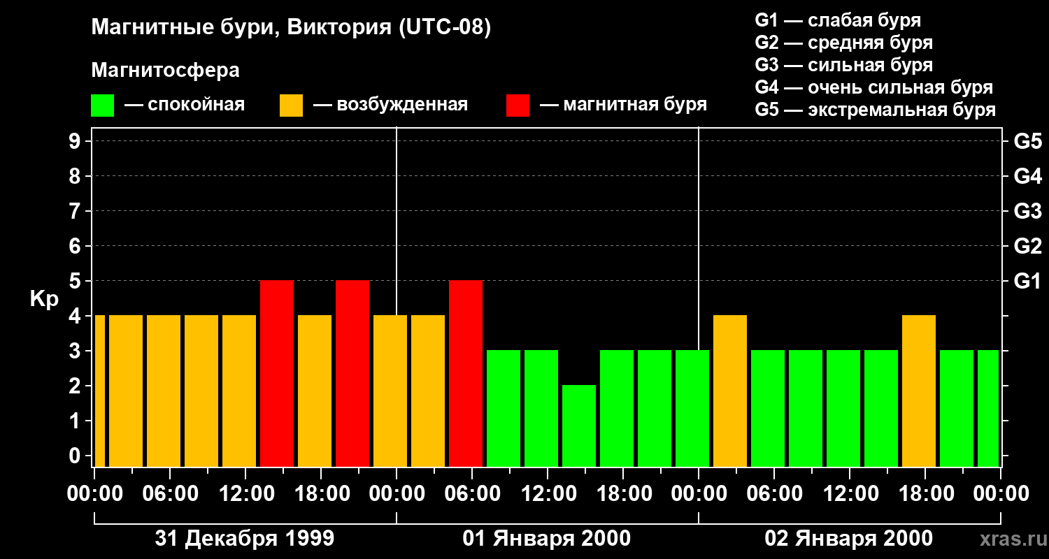 Изменения геомагнитного индекса Kp с 31 декабря 1999 года по 2 января 2000 года для средних широт