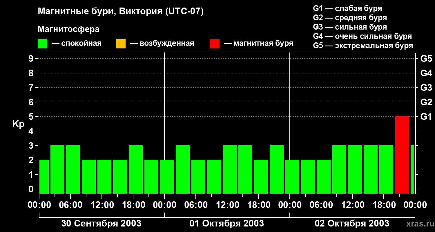 Изменения геомагнитного индекса Kp с 30 сентября по 2 октября 2003 года для средних широт