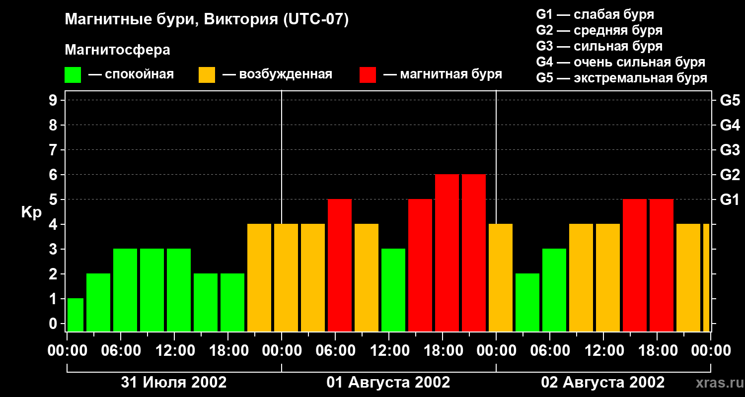 Изменения геомагнитного индекса Kp с 31 июля по 2 августа 2002 года для средних широт