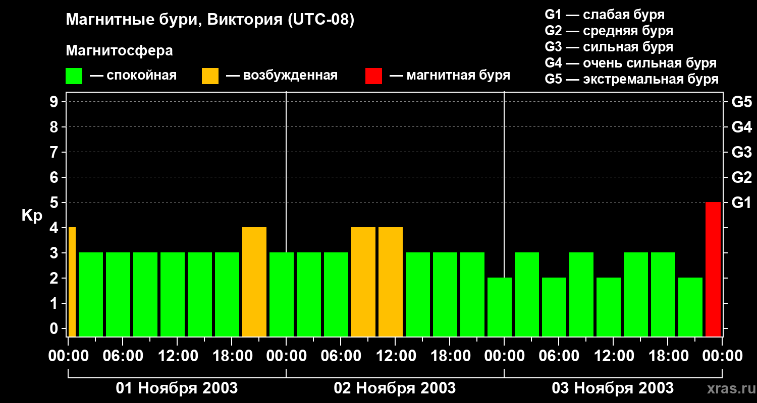 Изменения геомагнитного индекса Kp с 1 по 3 ноября 2003 года для средних широт