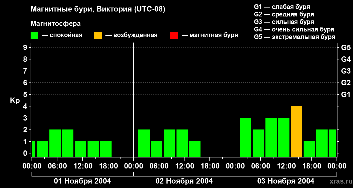 Изменения геомагнитного индекса Kp с 1 по 3 ноября 2004 года для средних широт