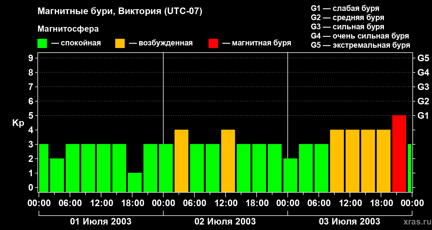 Изменения геомагнитного индекса Kp с 1 по 3 июля 2003 года для средних широт
