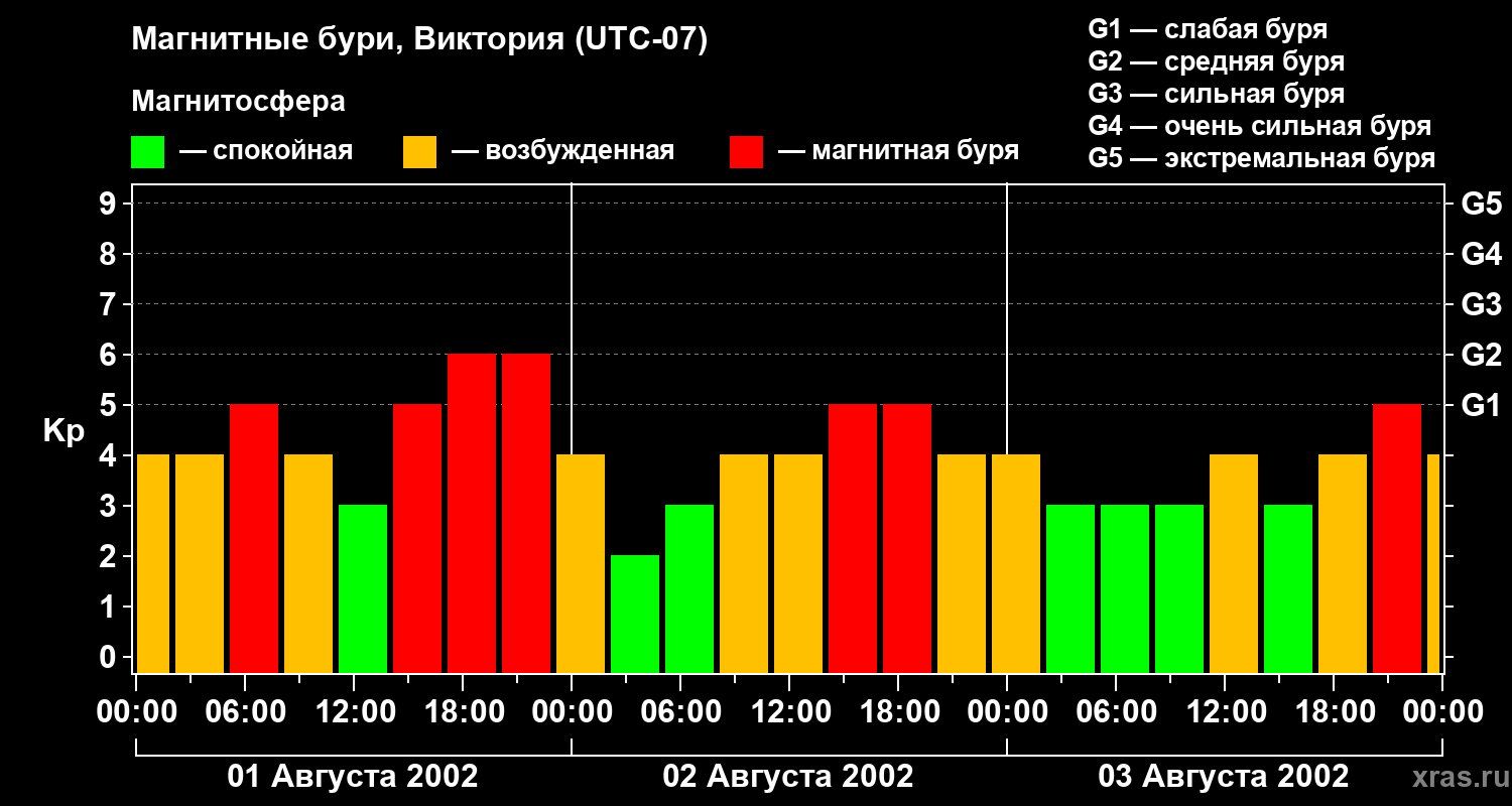 Изменения геомагнитного индекса Kp с 1 по 3 августа 2002 года для средних широт