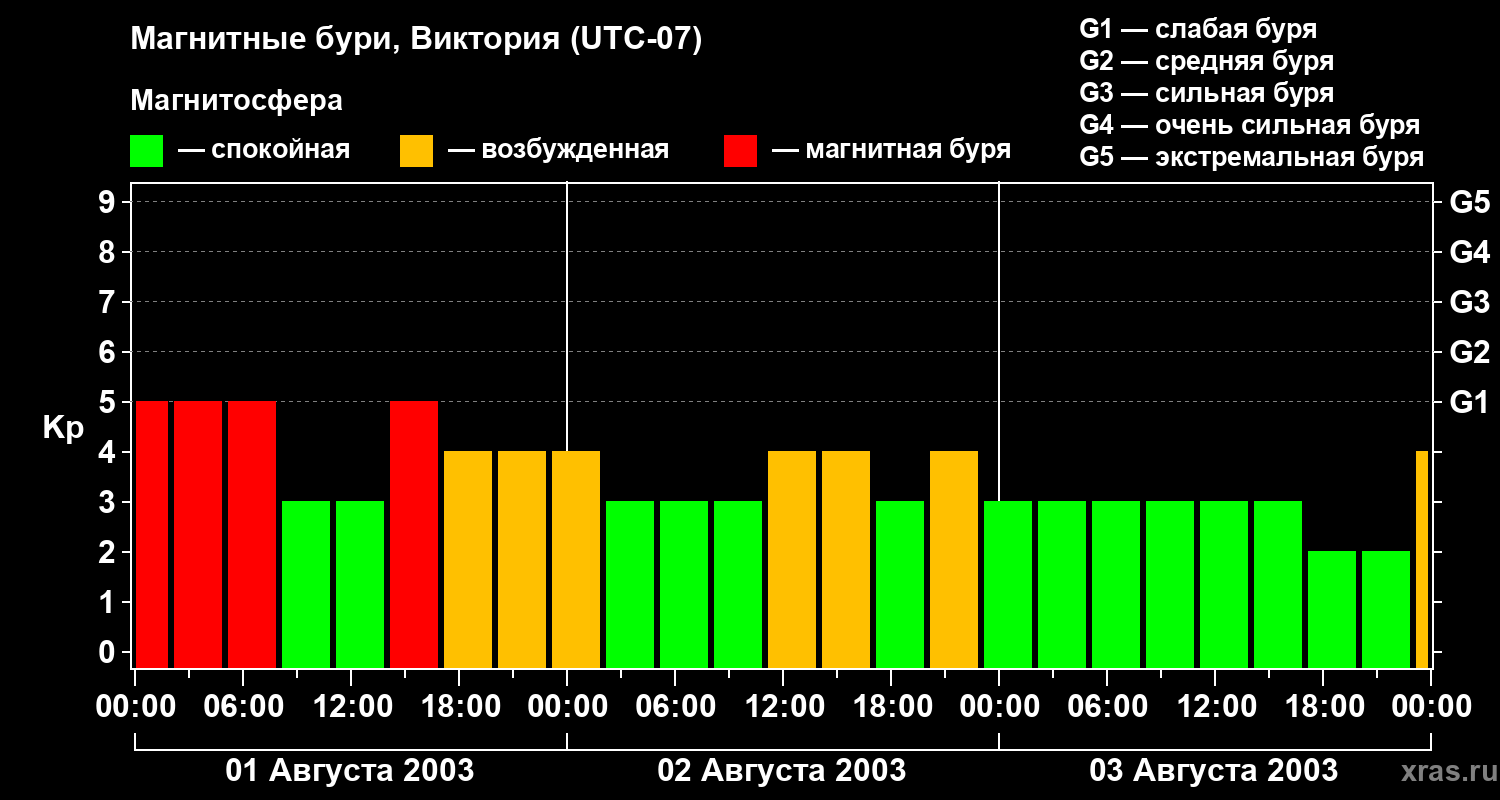 Изменения геомагнитного индекса Kp с 1 по 3 августа 2003 года для средних широт