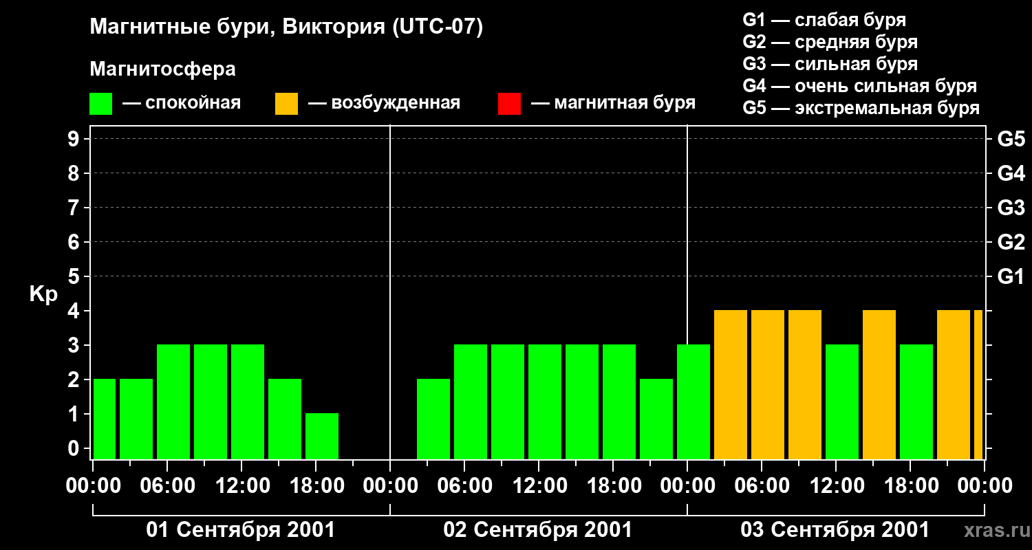 Изменения геомагнитного индекса Kp с 1 по 3 сентября 2001 года для средних широт