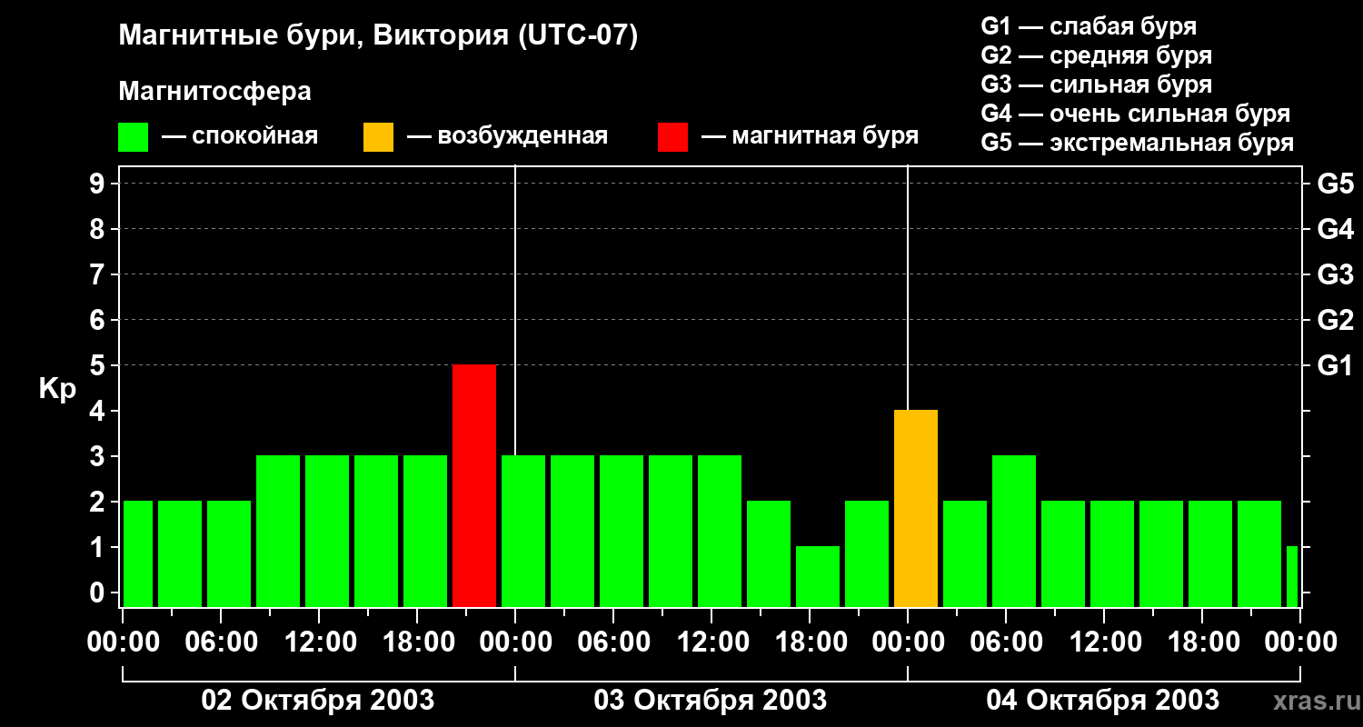 Изменения геомагнитного индекса Kp с 2 по 4 октября 2003 года для средних широт