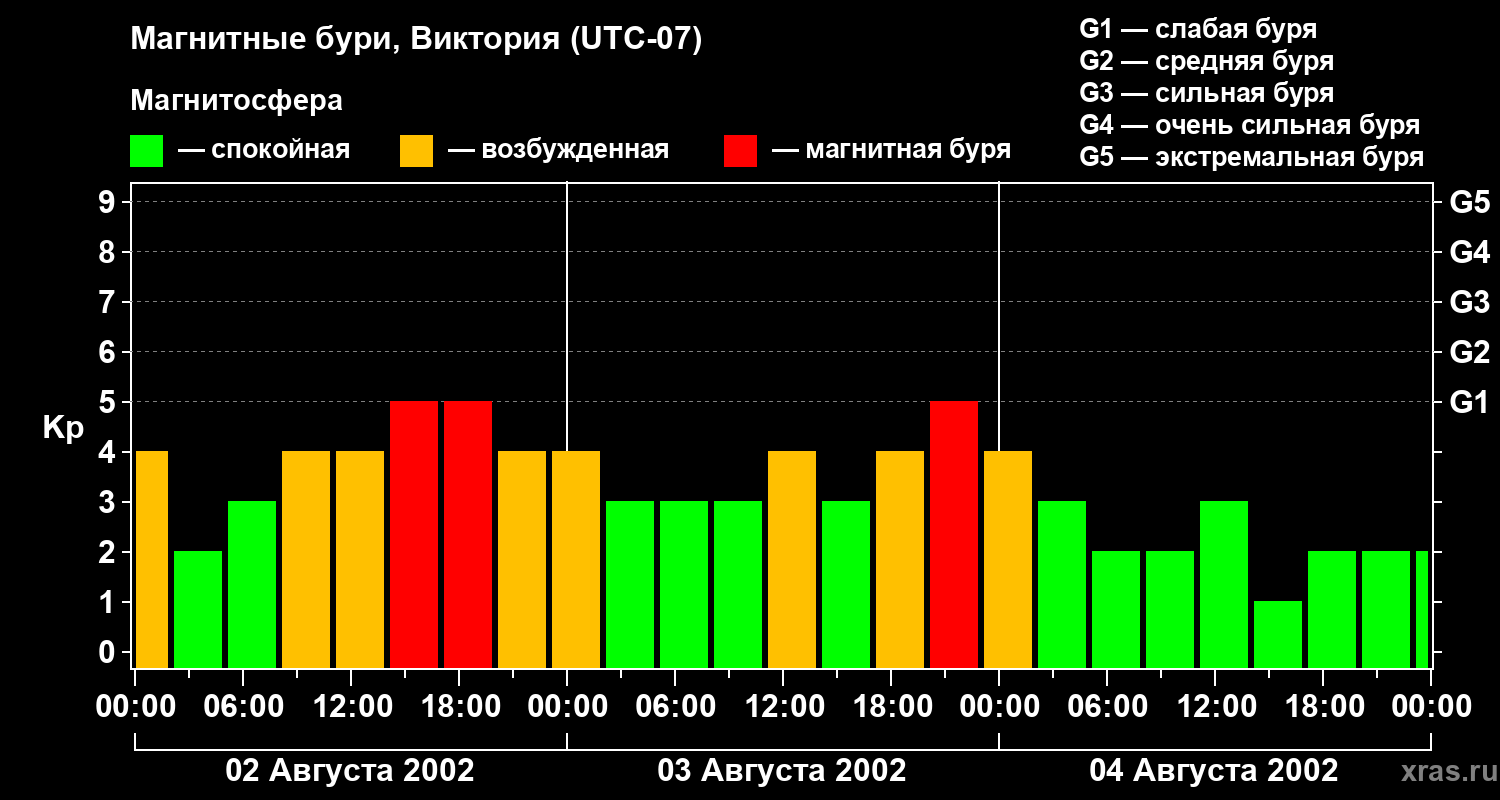 Изменения геомагнитного индекса Kp с 2 по 4 августа 2002 года для средних широт