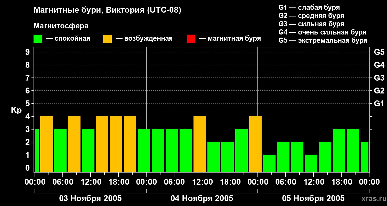 Изменения геомагнитного индекса Kp с 3 по 5 ноября 2005 года для средних широт