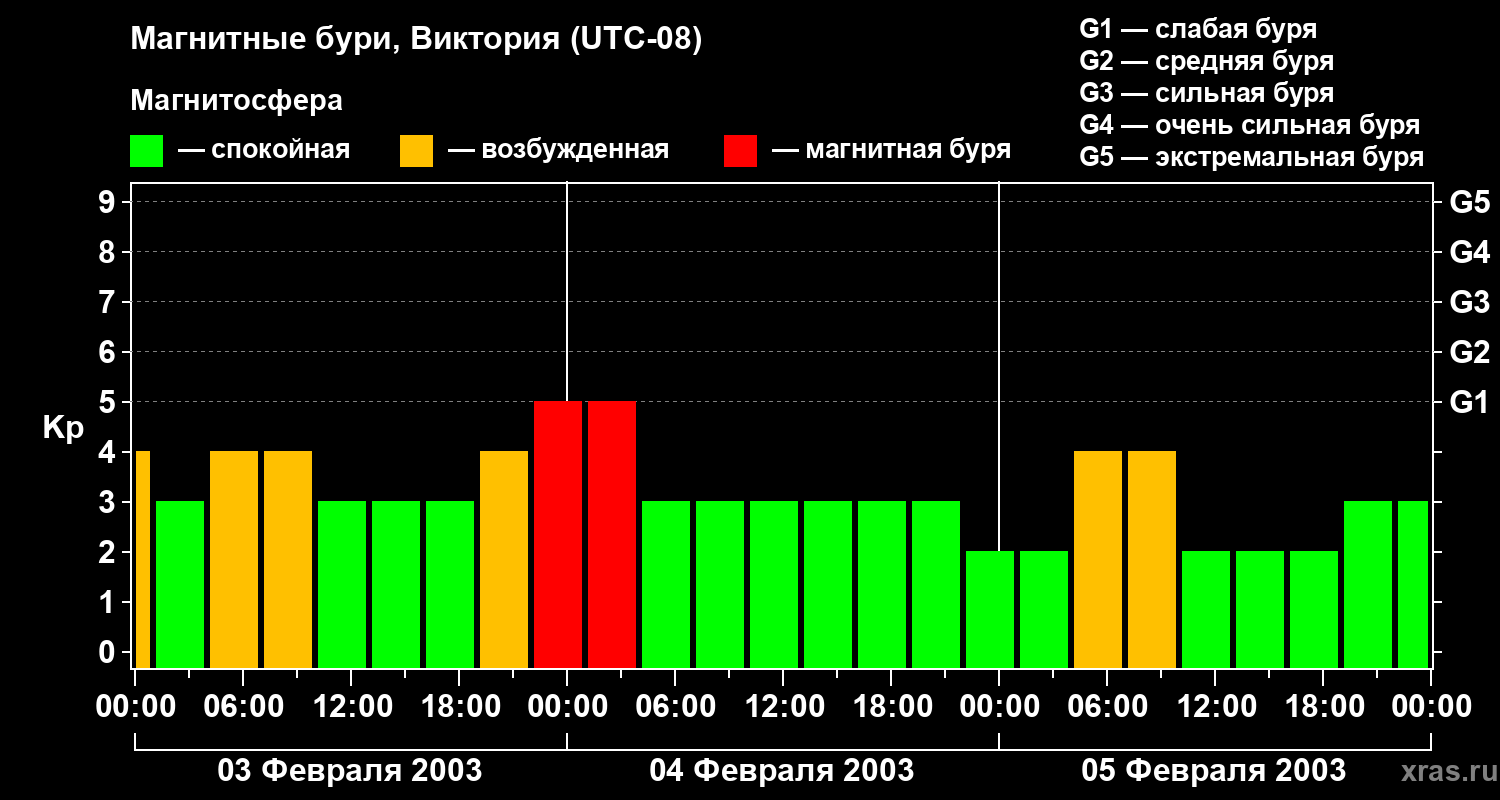 Изменения геомагнитного индекса Kp с 3 по 5 февраля 2003 года для средних широт