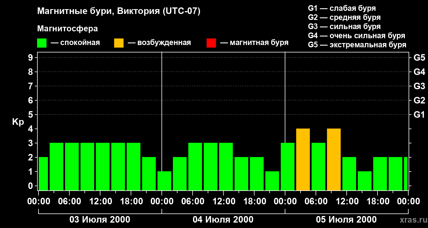 Изменения геомагнитного индекса Kp с 3 по 5 июля 2000 года для средних широт