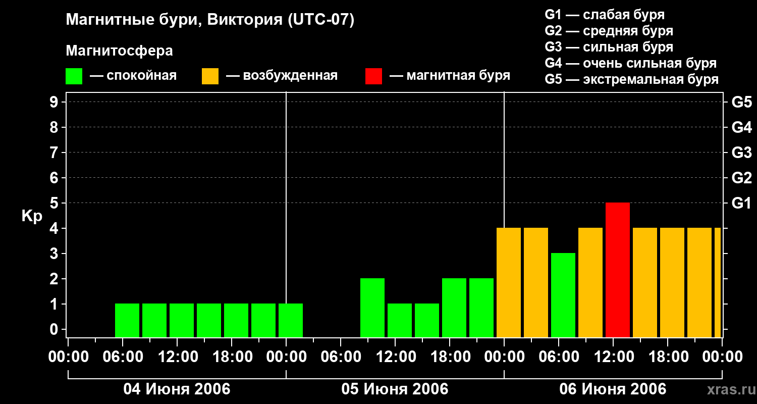 Изменения геомагнитного индекса Kp с 4 по 6 июня 2006 года для средних широт