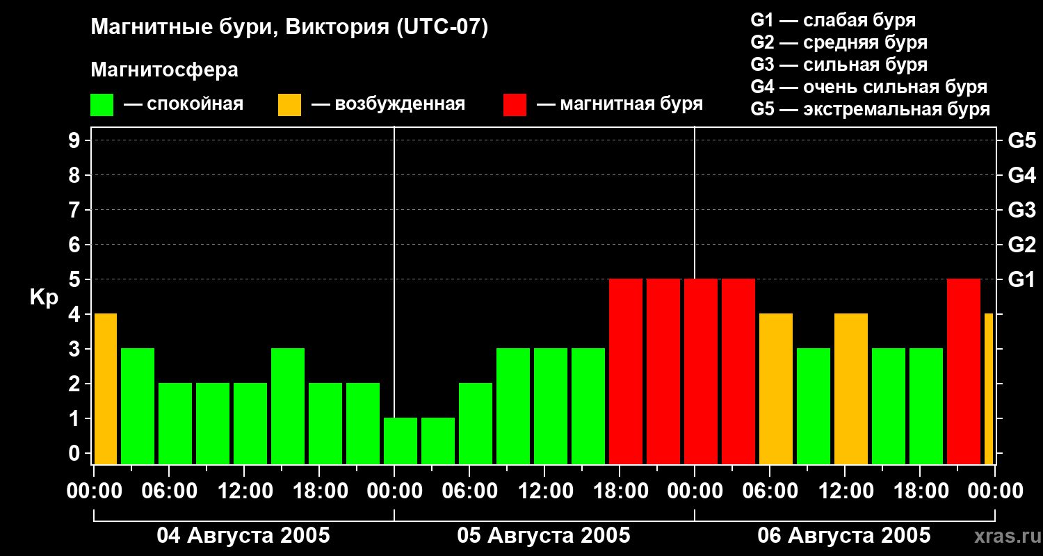 Изменения геомагнитного индекса Kp с 4 по 6 августа 2005 года для средних широт
