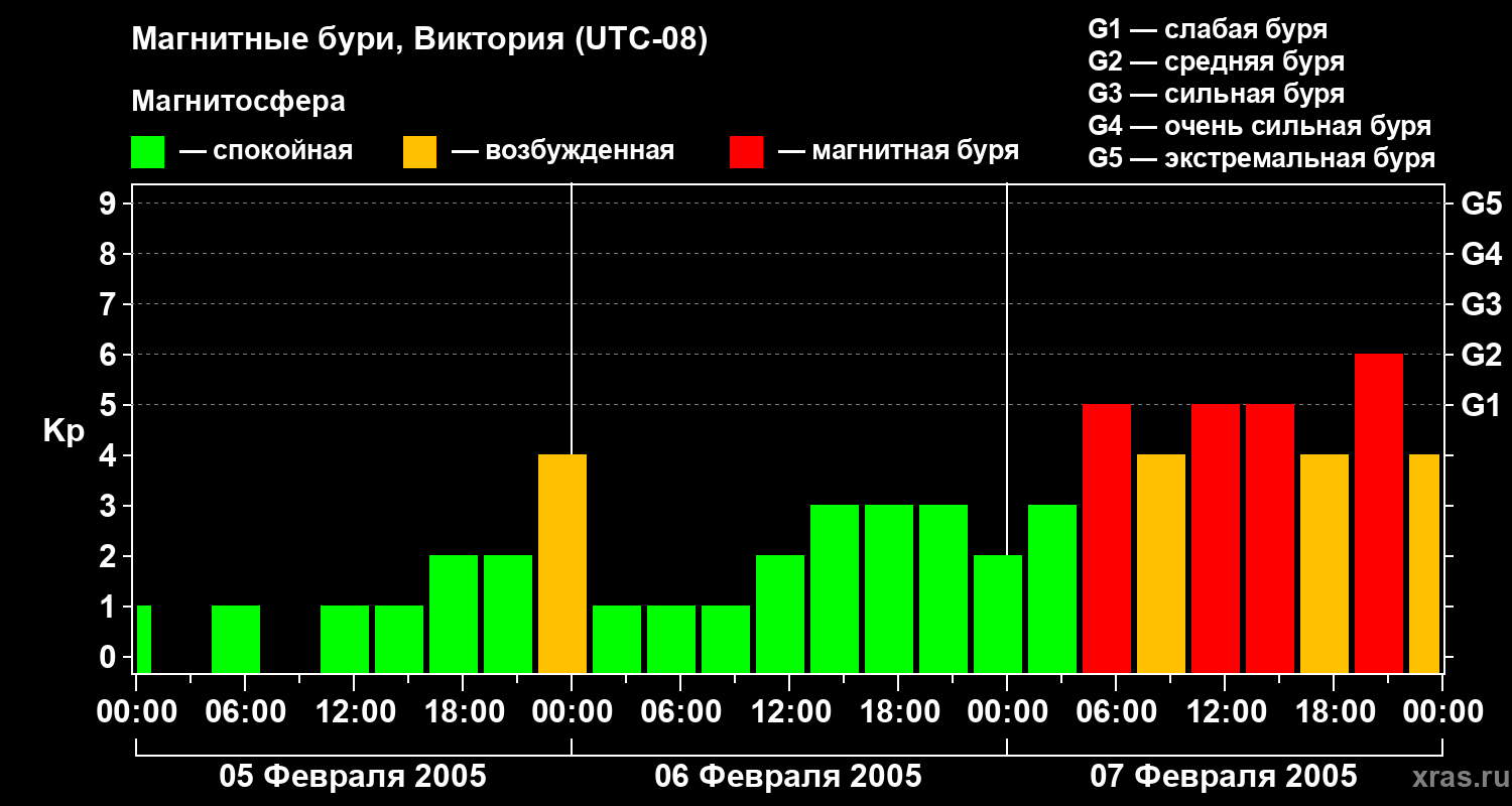 Изменения геомагнитного индекса Kp с 5 по 7 февраля 2005 года для средних широт