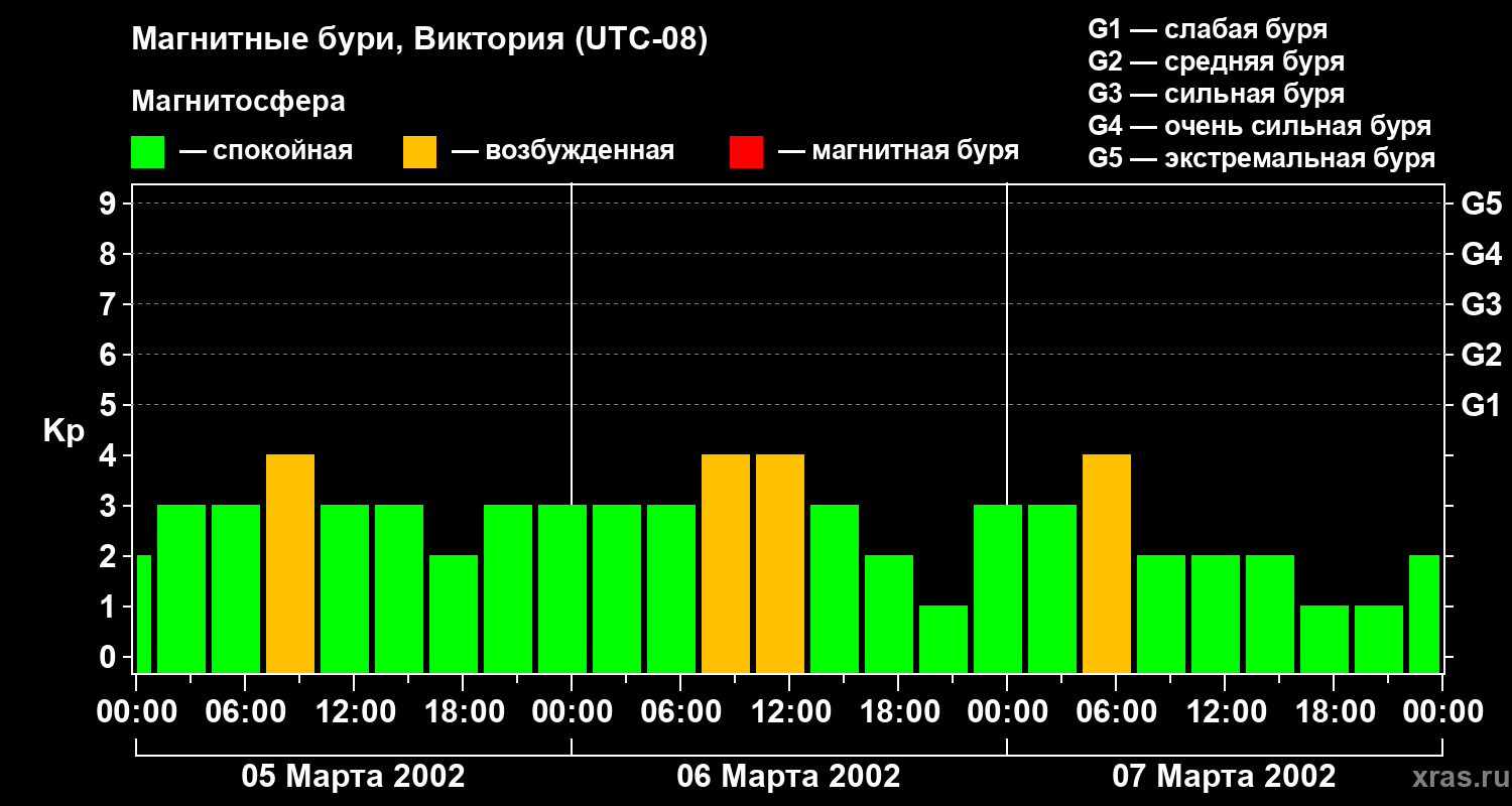 Изменения геомагнитного индекса Kp с 5 по 7 марта 2002 года для средних широт