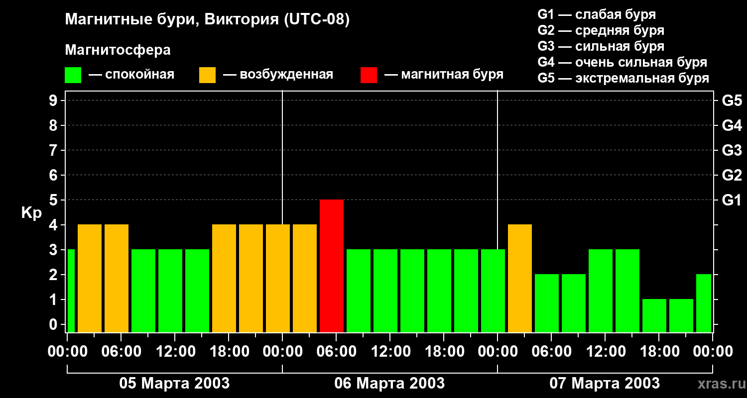 Изменения геомагнитного индекса Kp с 5 по 7 марта 2003 года для средних широт