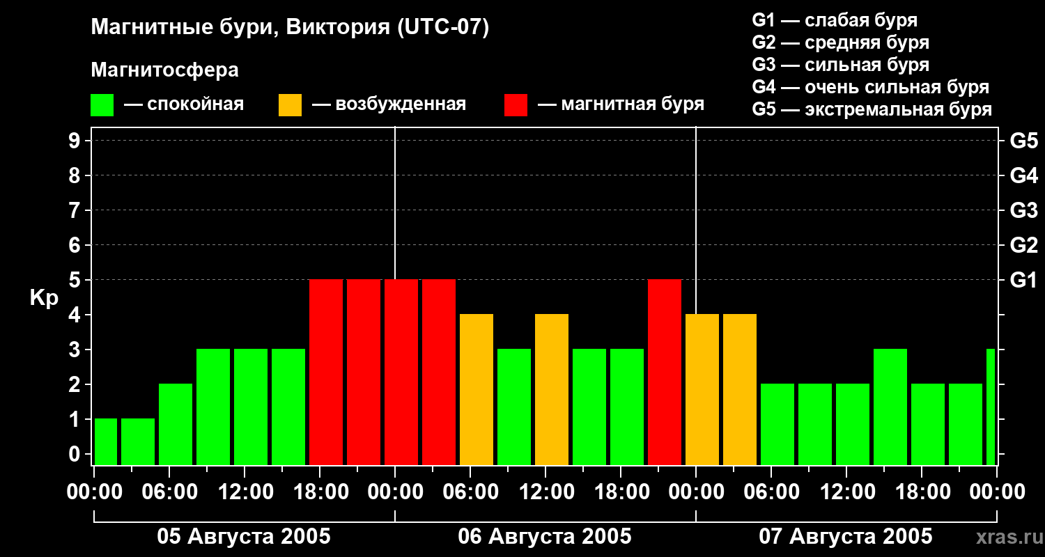 Изменения геомагнитного индекса Kp с 5 по 7 августа 2005 года для средних широт