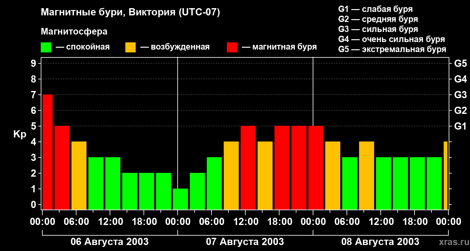 Изменения геомагнитного индекса Kp с 6 по 8 августа 2003 года для средних широт