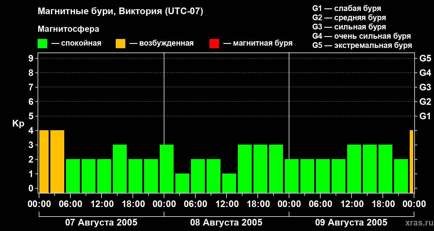 Изменения геомагнитного индекса Kp с 7 по 9 августа 2005 года для средних широт
