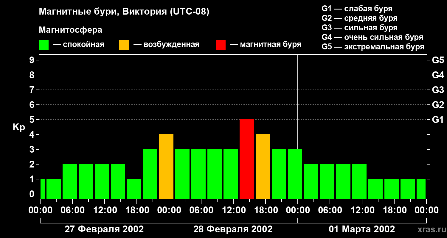 Изменения геомагнитного индекса Kp с 27 февраля по 1 марта 2002 года для средних широт