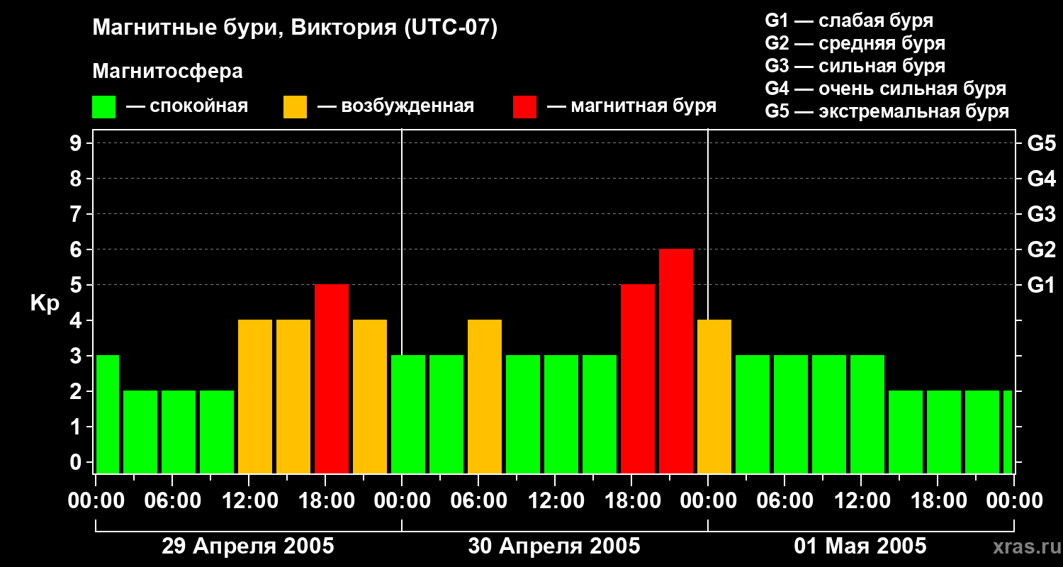 Изменения геомагнитного индекса Kp с 29 апреля по 1 мая 2005 года для средних широт