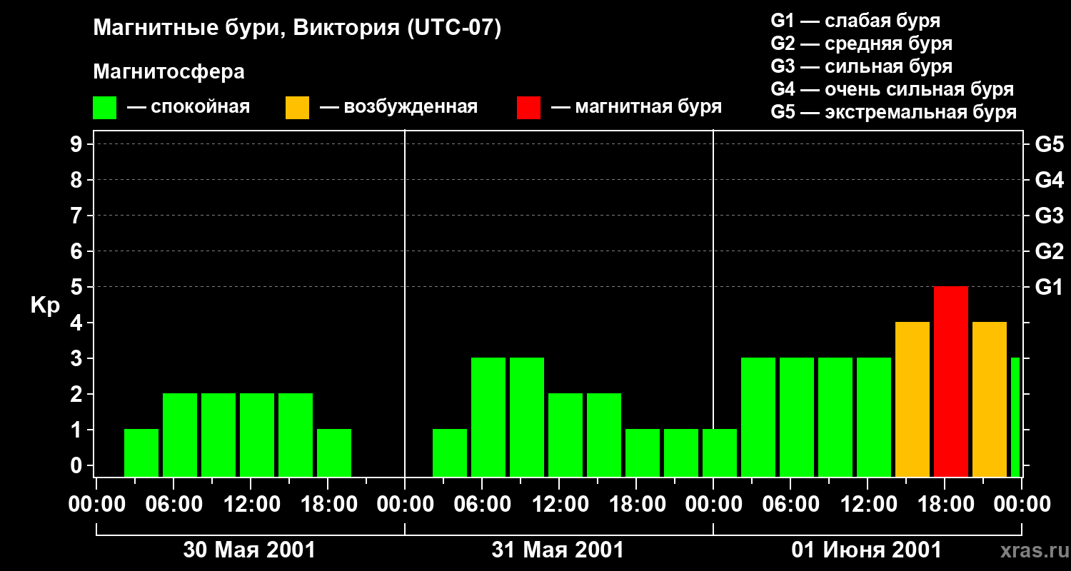 Изменения геомагнитного индекса Kp с 30 мая по 1 июня 2001 года для средних широт