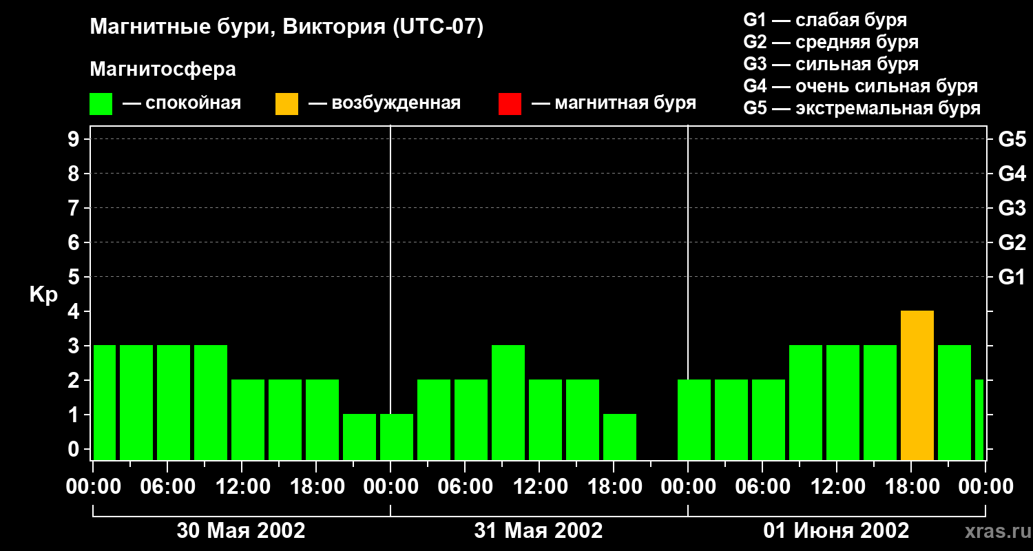 Изменения геомагнитного индекса Kp с 30 мая по 1 июня 2002 года для средних широт