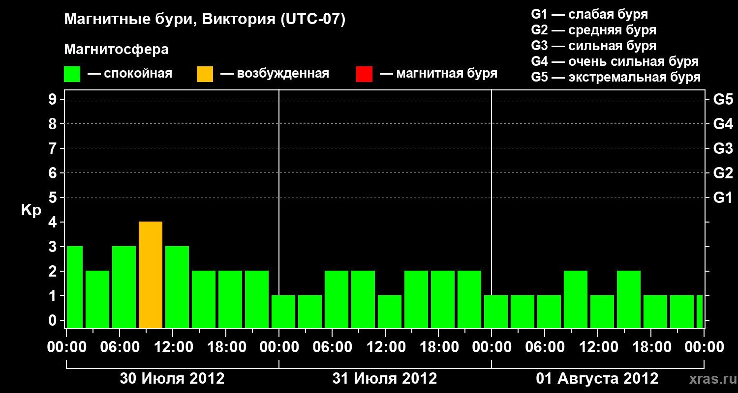 Изменения геомагнитного индекса Kp с 30 июля по 1 августа 2012 года для средних широт