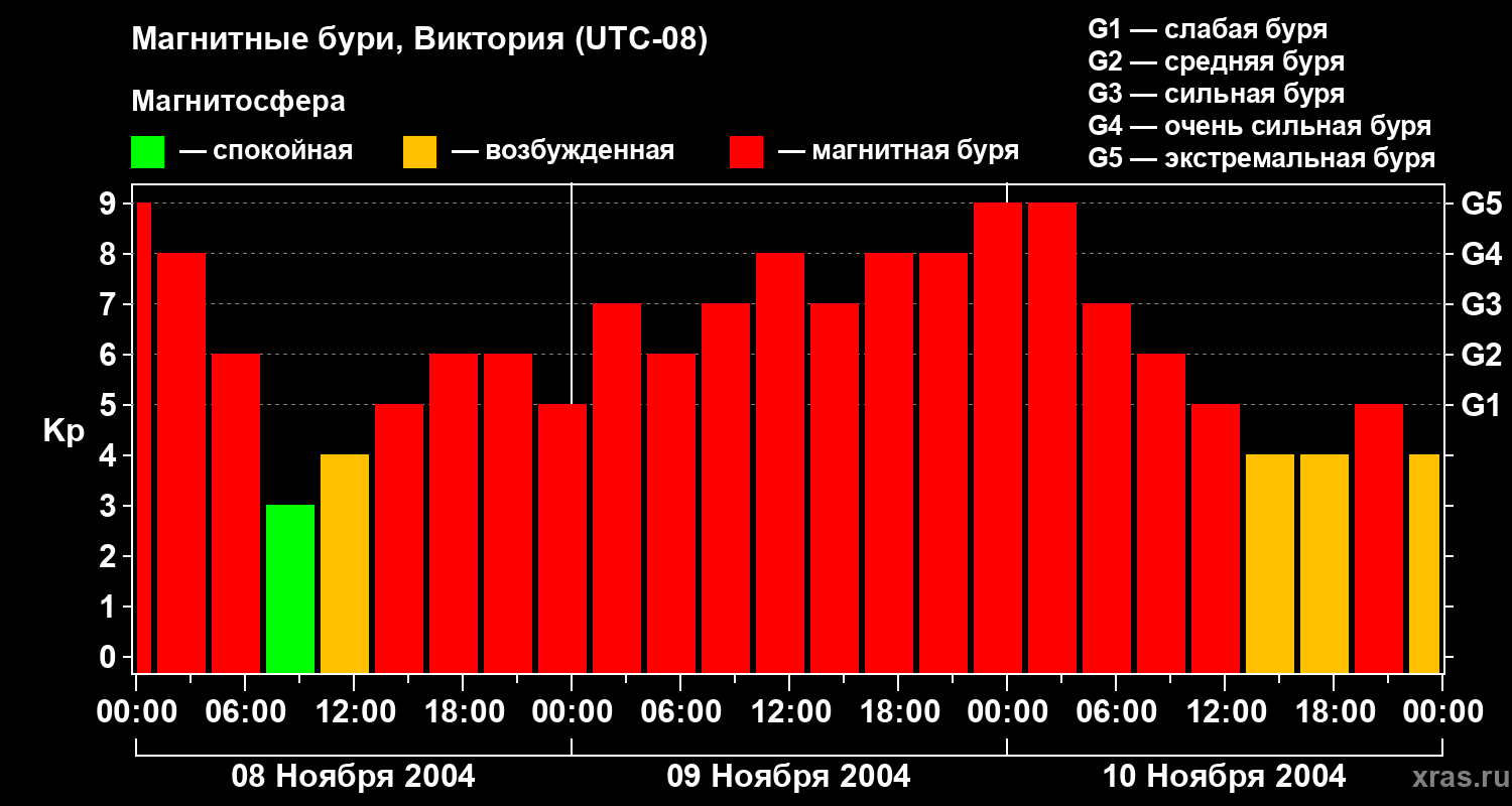 Изменения геомагнитного индекса Kp с 8 по 10 ноября 2004 года для средних широт