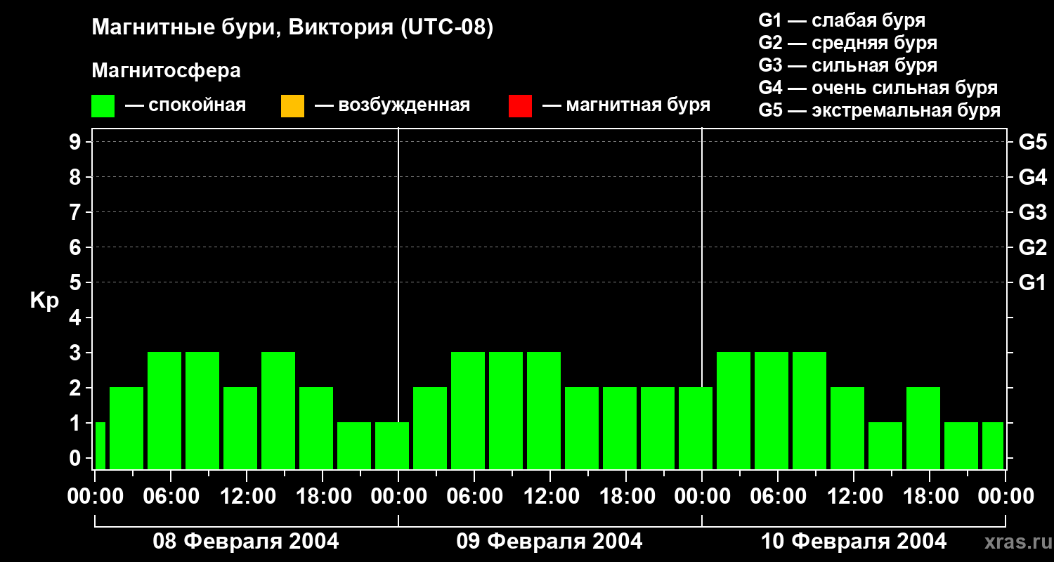 Изменения геомагнитного индекса Kp с 8 по 10 февраля 2004 года для средних широт