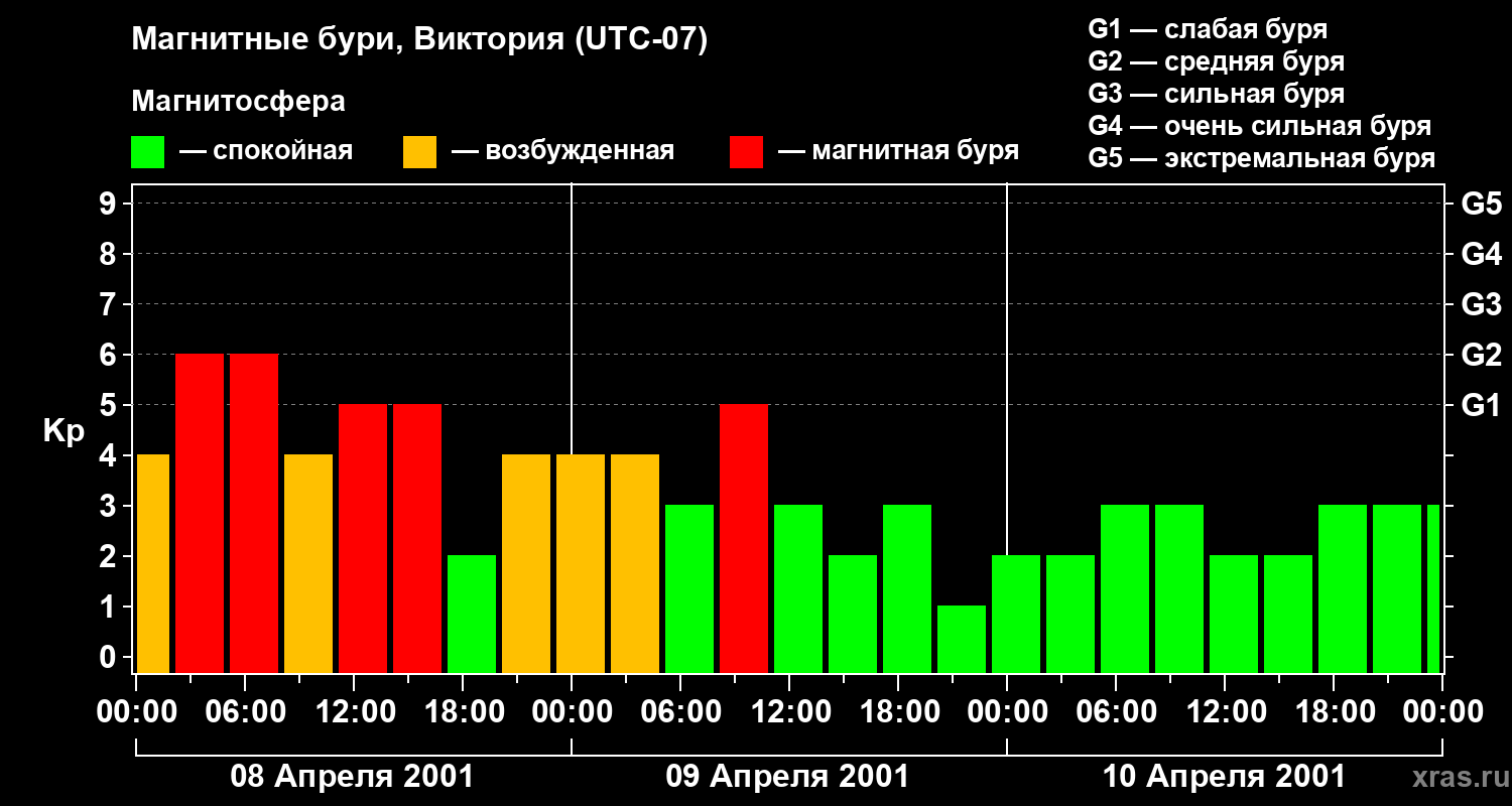 Изменения геомагнитного индекса Kp с 8 по 10 апреля 2001 года для средних широт