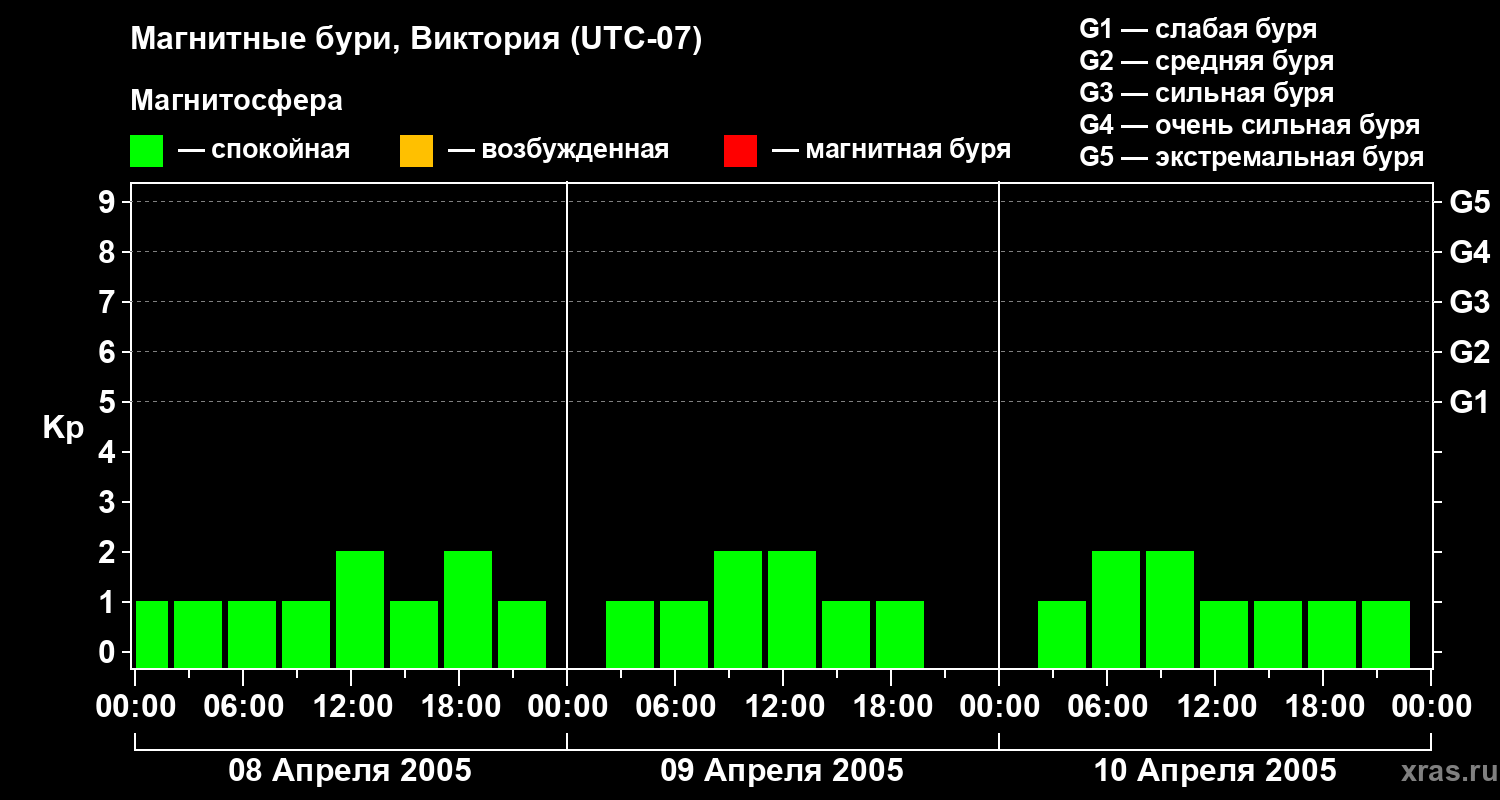 Изменения геомагнитного индекса Kp с 8 по 10 апреля 2005 года для средних широт