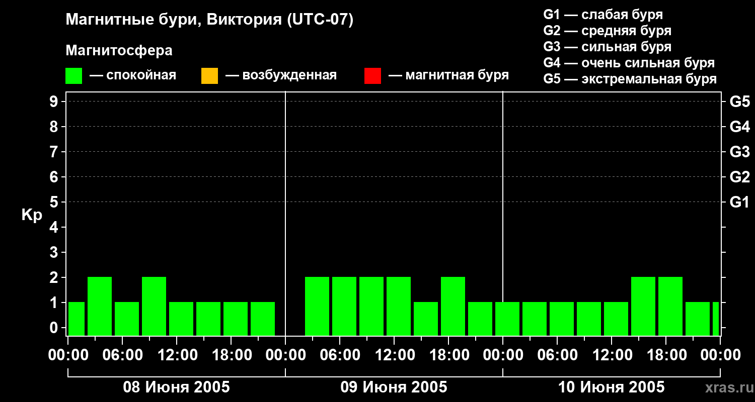 Изменения геомагнитного индекса Kp с 8 по 10 июня 2005 года для средних широт