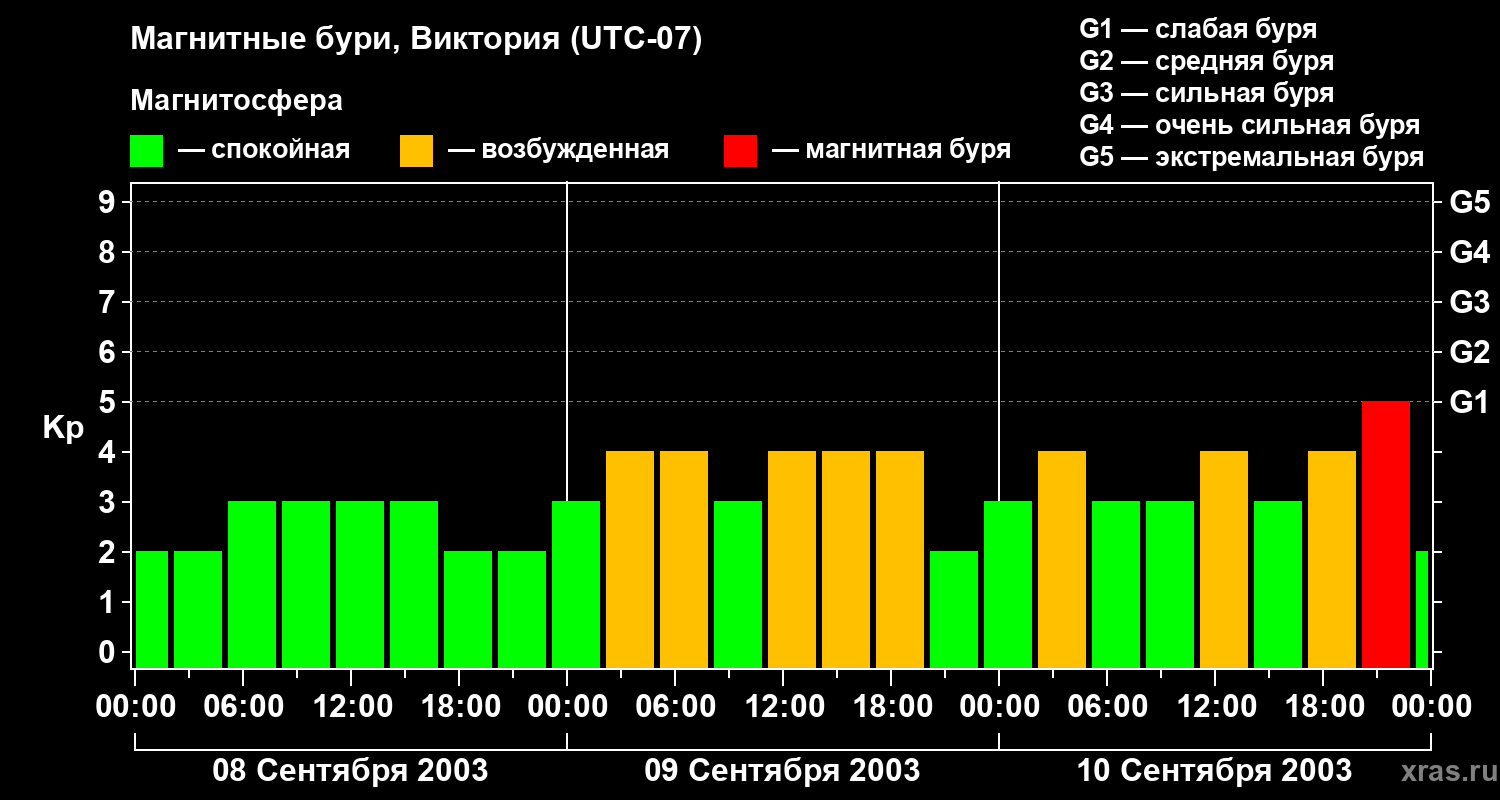 Изменения геомагнитного индекса Kp с 8 по 10 сентября 2003 года для средних широт