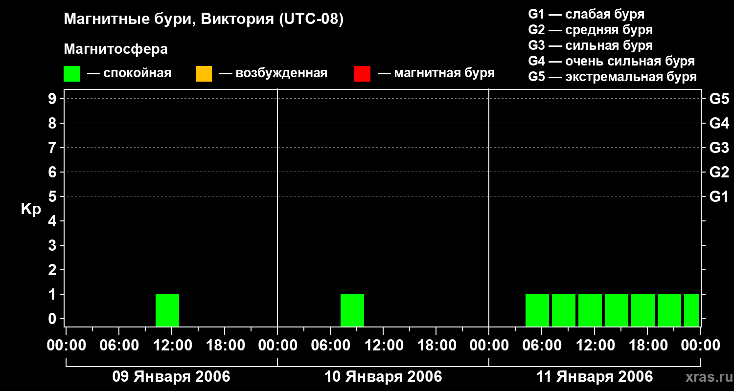Изменения геомагнитного индекса Kp с 9 по 11 января 2006 года для средних широт