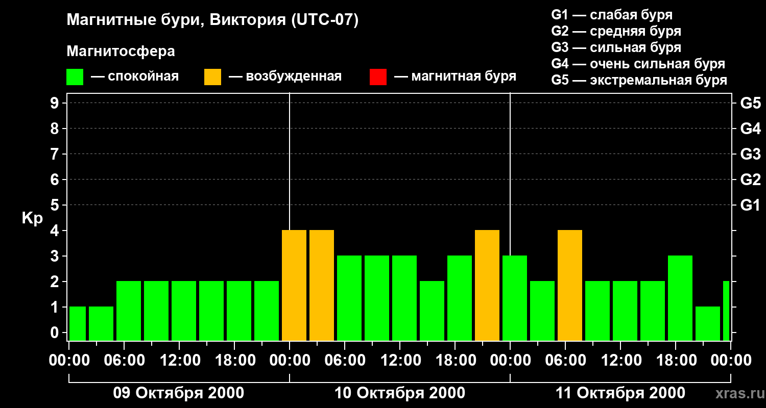 Изменения геомагнитного индекса Kp с 9 по 11 октября 2000 года для средних широт