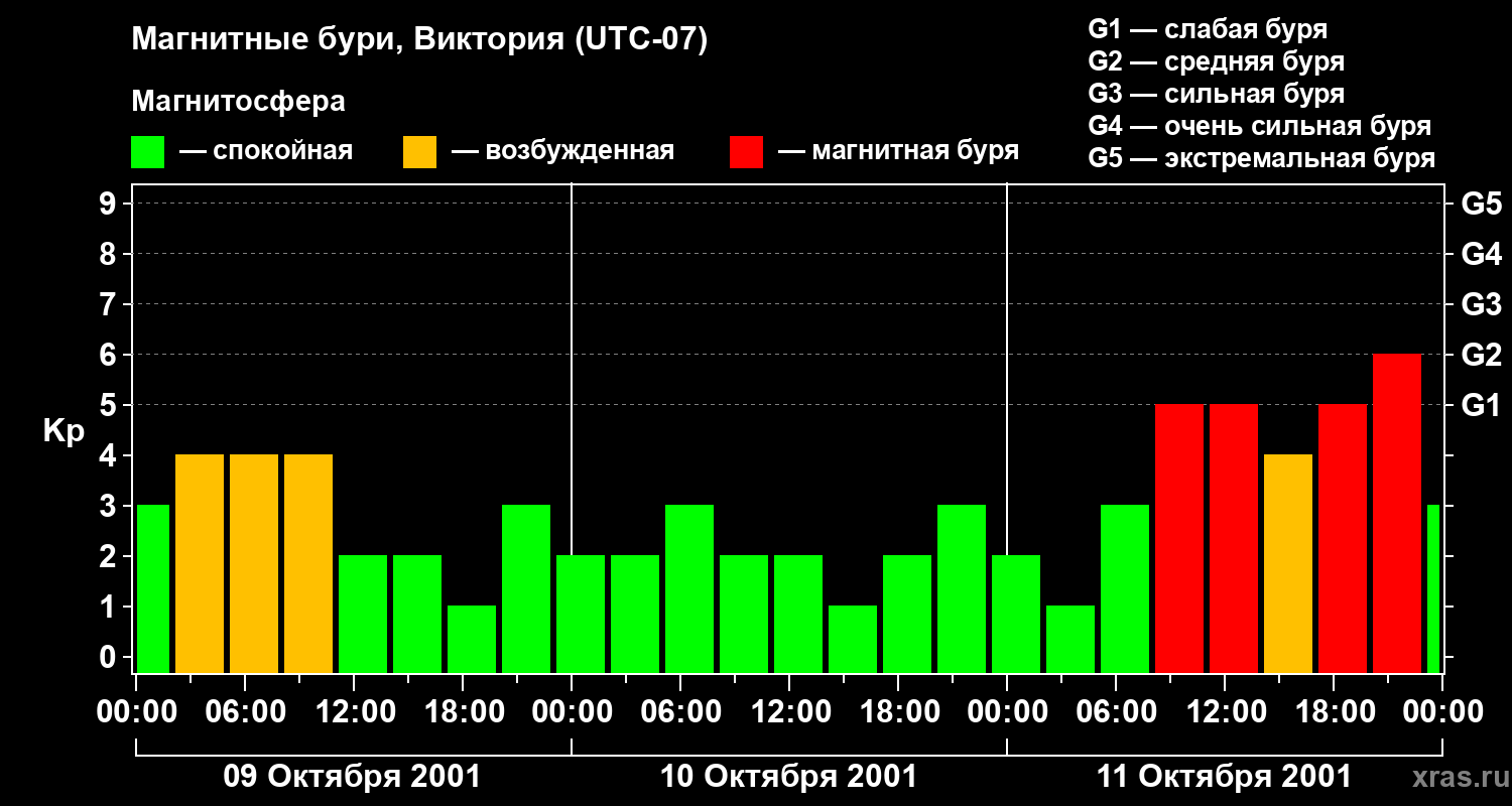 Изменения геомагнитного индекса Kp с 9 по 11 октября 2001 года для средних широт