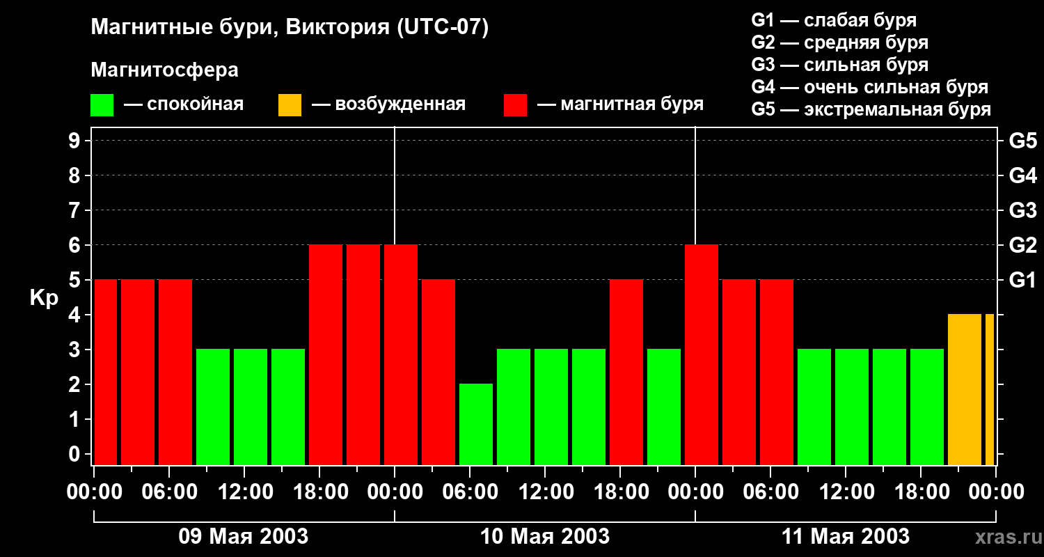 Изменения геомагнитного индекса Kp с 9 по 11 мая 2003 года для средних широт
