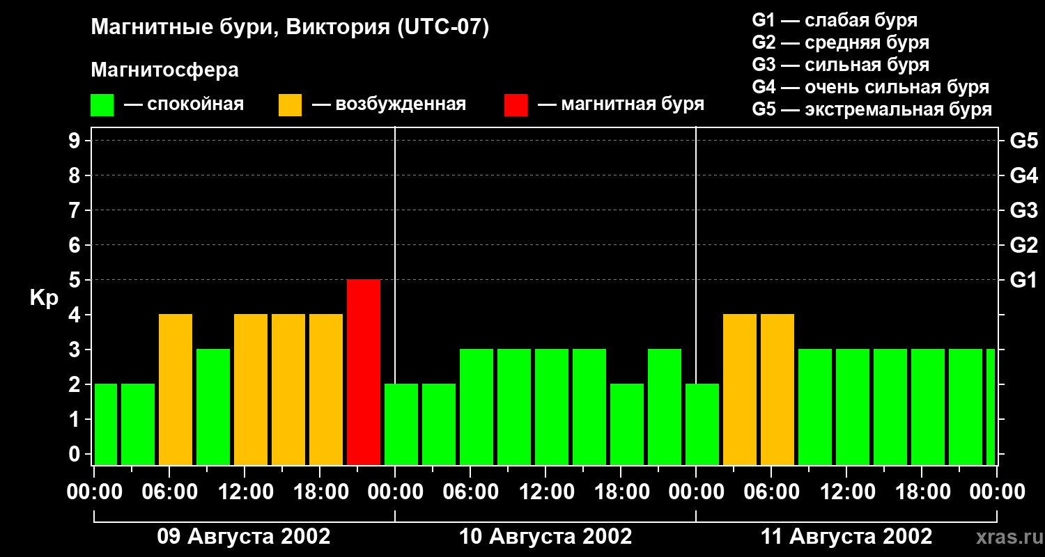 Изменения геомагнитного индекса Kp с 9 по 11 августа 2002 года для средних широт