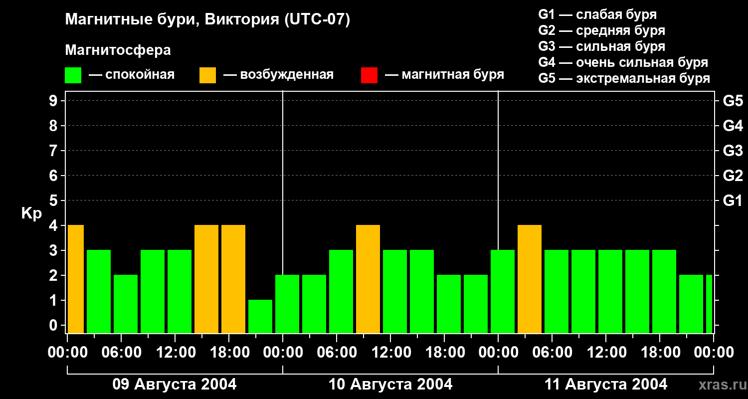 Изменения геомагнитного индекса Kp с 9 по 11 августа 2004 года для средних широт