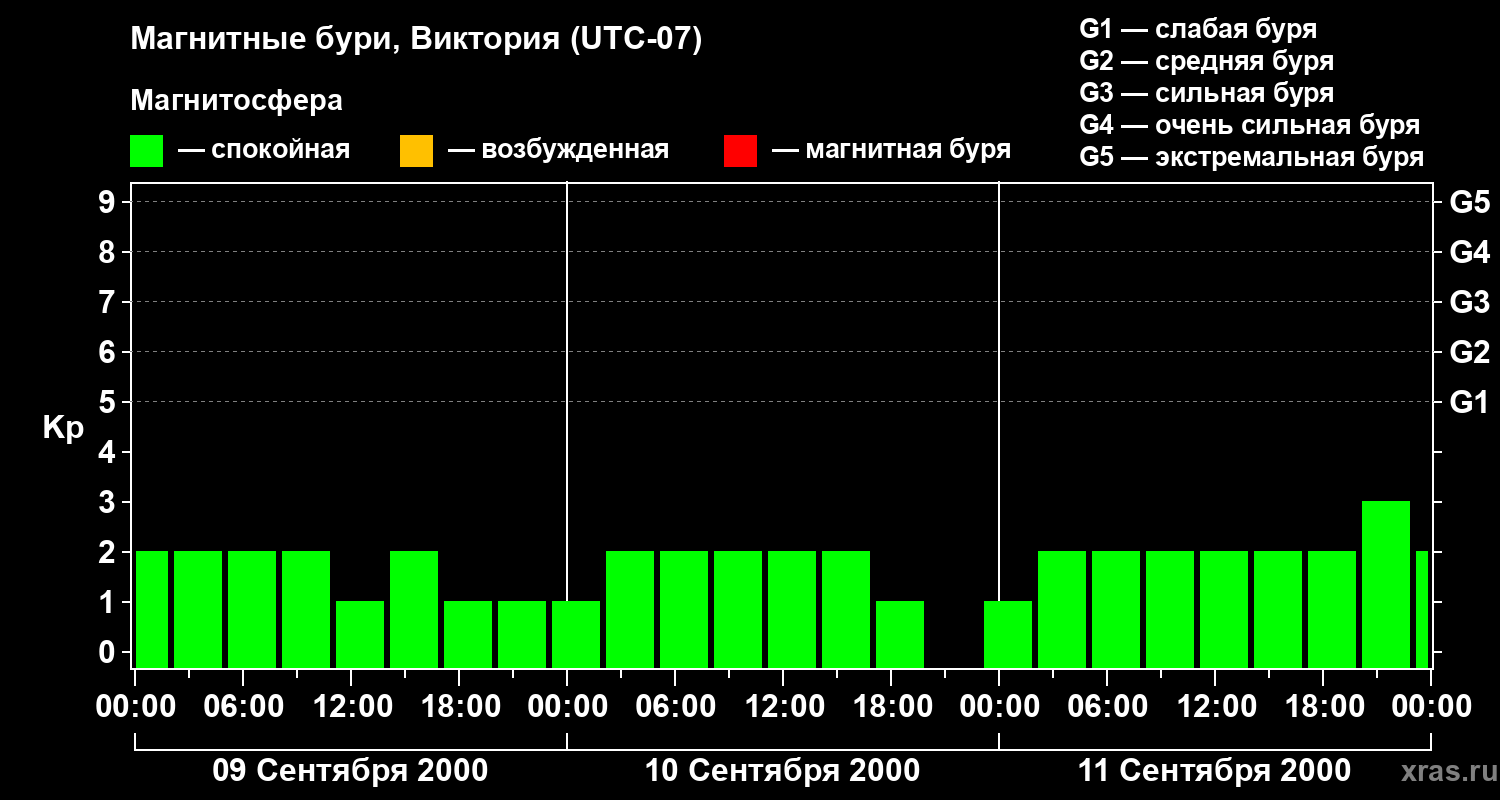 Изменения геомагнитного индекса Kp с 9 по 11 сентября 2000 года для средних широт