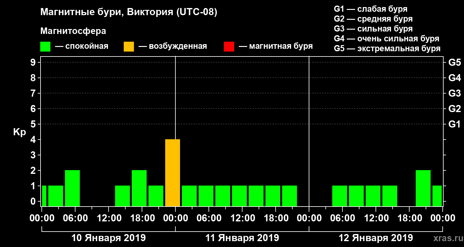 Изменения геомагнитного индекса Kp с 10 по 12 января 2019 года для средних широт