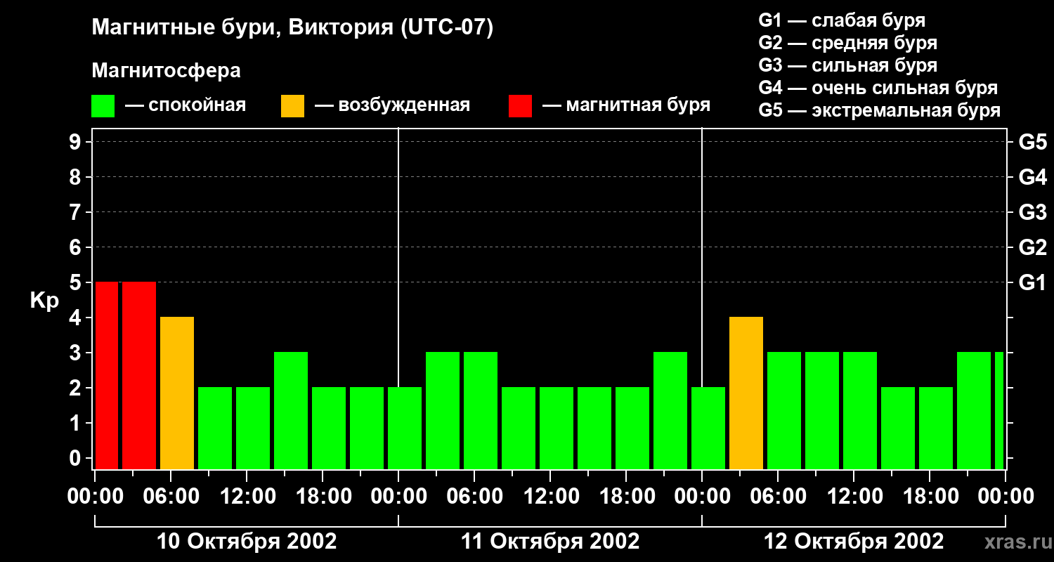 Изменения геомагнитного индекса Kp с 10 по 12 октября 2002 года для средних широт
