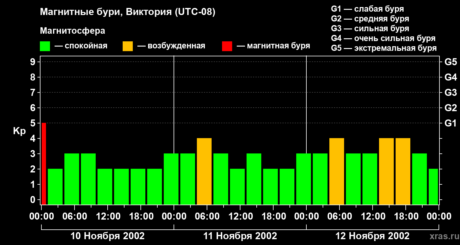 Изменения геомагнитного индекса Kp с 10 по 12 ноября 2002 года для средних широт