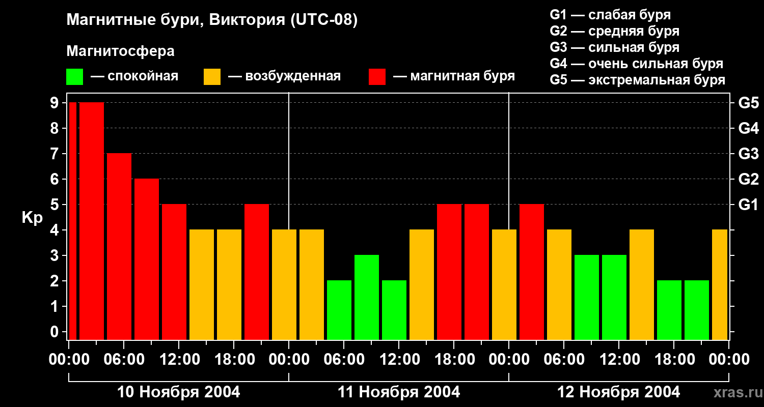 Изменения геомагнитного индекса Kp с 10 по 12 ноября 2004 года для средних широт
